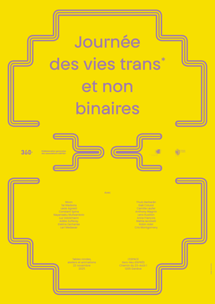 Sur cette page vous trouverez toutes les informations (inscriptions, programmation, info sur les intervenant-e-x-s) de la Journée des vies trans et non binaires. Cet événement est organisé par la Fédération genevoise des associations LGBTIQ+ et l’Association 360, avec le soutien de la Ville de Genève. L’événement aura lieu à L’Espace tiers lieu, à Genève.